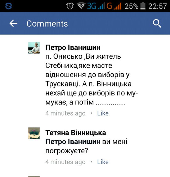 Ще один представник політичної сили «Солідарність» Петро Іванишин, колишній виконавчий директор Трускавецького водоканалу, опустився до публічних погроз. Так у відкритому коментуванні до допису у fasebook Петро Кирилович написав: «…А п.Вінницька нехай ще до виборів по му-мукає, а потім……………….».