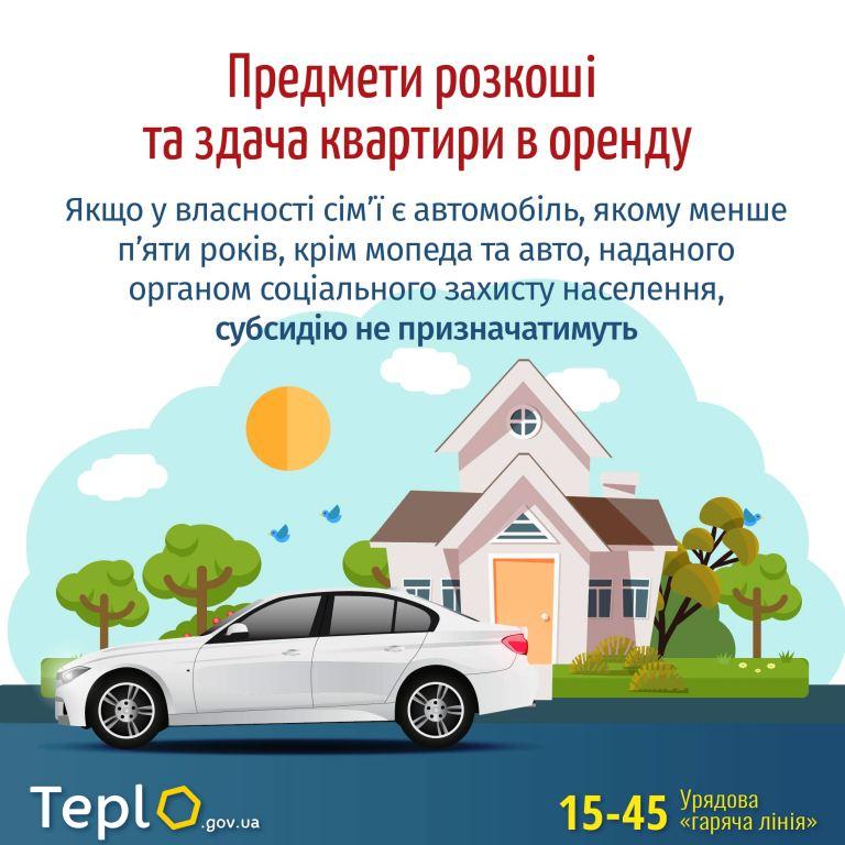 Тепер, якщо у власності сім’ї є автомобіль, якому менше п’яти років з дати випуску, крім мопеда та авто, наданого органом соціального захисту населення, субсидію не призначатимуть.