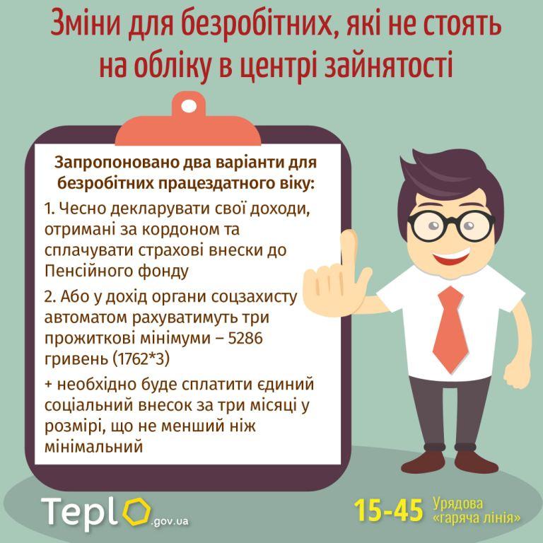 Запропоновано два варіанти для безробітних, які не стоять на обліку в центрі зайнятості, – чесно декларувати свої доходи, отримані за кордоном та сплачувати страхові внески до Пенсійного фонду, або органи соцзахисту автоматом рахуватимуть таким людям працездатного віку у дохід три прожиткові мінімуми – 5286 гривень (1762*3) – якщо вони хочуть користуватися соціальною допомогою. Також необхідно буде сплатити єдиний соціальний внесок за три місяці у розмірі, що не менший ніж мінімальний.