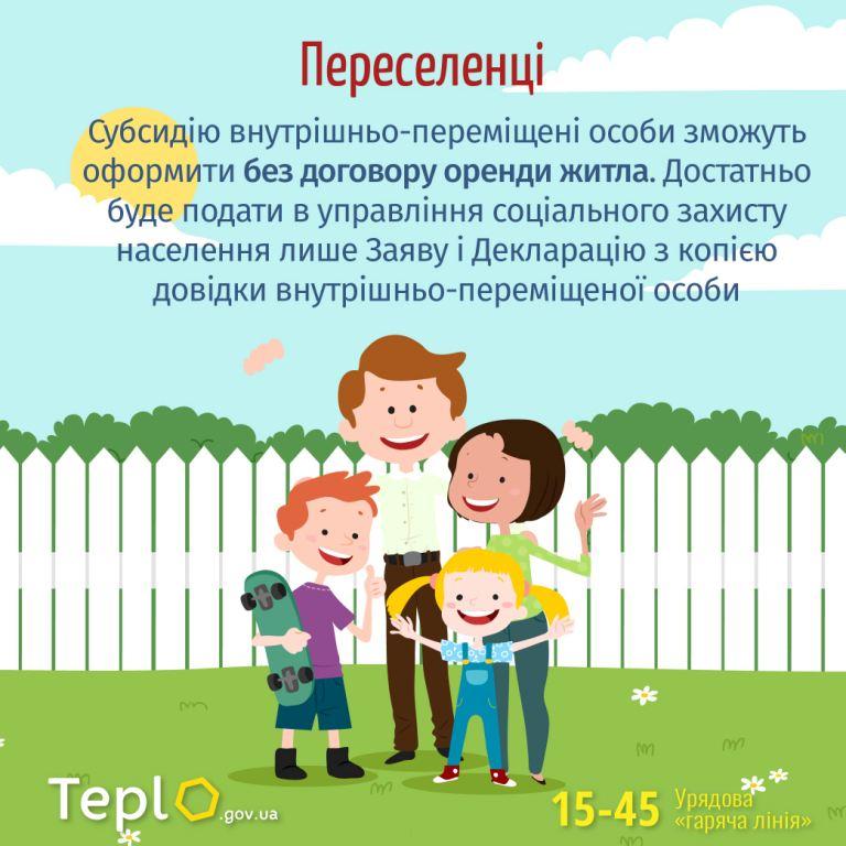 Позитивне нововведення для внутрішньо-переміщених осіб та об’єднаних територіальних громад. Субсидію ВПО можна буде оформити без договору оренди житла. Достатньо буде подати в управління соціального захисту населення лише Заяву і Декларацію, у якій зазначається склад домогосподарства з урахуванням внутрішньо-переміщених осіб. І на підставі акту обстеження матеріально-побутових умов буде призначено житлову субсидію.