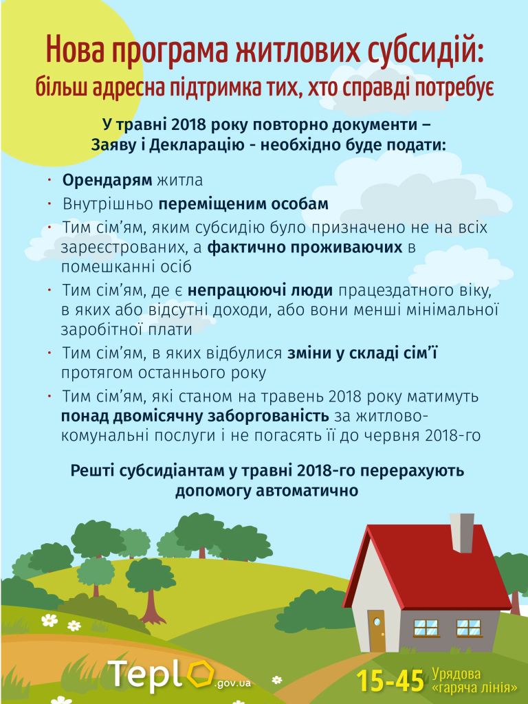 Такі життєві випадки породили в суспільстві відчуття соціальної несправедливості. Відтак, нова програма житлових субсидій, яка починає діяти з 1 травня 2018 року, є перш за все соціально справедливою та більш адресною. Зміни направлені на те, щоб всі ті, хто справді потребує субсидії – її отримали. При цьому вводяться такі механізми, при яких багаті люди більше не зможуть паразитувати за кошт всіх платників податків.