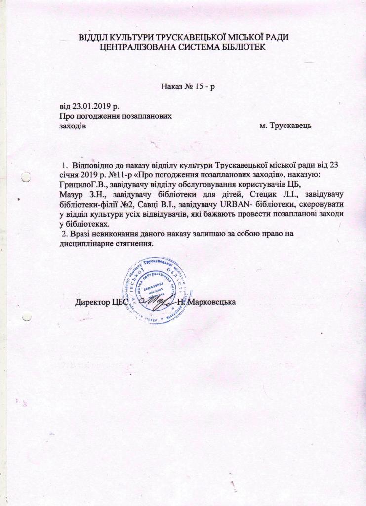 Сьогодні, 23 січня, директором Трускавецької ЦБС Наталією Марковецькою видано наказ № 15-р «Про погодження позапланових заходів», яким керівників структурних підрозділів зобов’язується скеровувати у відділ культури всіх користувачів бібліотек, які мають намір проводити позапланової заходи,