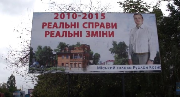 Діючий міський голова Руслан Козир натомість хотів похвалитись відремонтованою вулицею Шевченка, однак чи то через помилку при друку, чи то через «мегакрутий» дизайнерський хід її на борді практично не видно. Зате видно «Майстерню шоколаду» та «яйця долі», як називають місцеві жителі кулі перед «Міротелем». Самого Козира виставили настільки статним та великим, що його рекламу вже неофіційно назвали «Гулівер на шоколадній фабриці». Що ж до фрази «Реальні справи» – то ці справи оцінювати виборцям під час голосування.