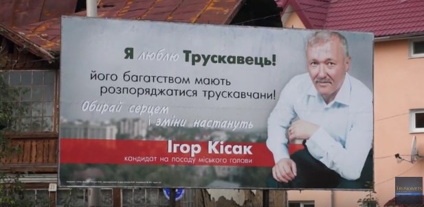 Іншим претендентом на посаду мера є Ігор Кісак. Ним використані більш вдалі фрази, однак дизайн реклами розроблений настільки непродумано, що борди виявились просто нечитабельними. Здалеку це виглядає, як «Я Трускавець», адже слово люблю написали білим кольором. Фотографії у нього виглядають більш вдалими і, якщо порівнювати з попередніми бігбордами пана Ігоря, які викликали в інтернеті хвилю насмішок та комедійних репостів, ця реклама є значно вдалішою.