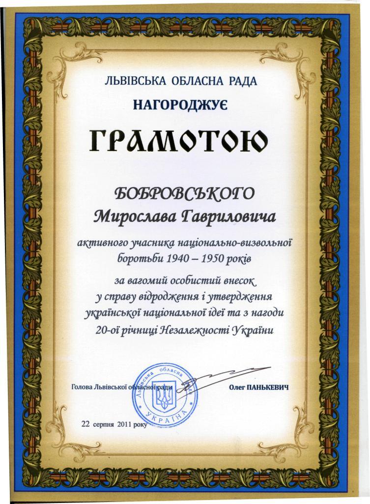 Тепер, коли Мирослава Гавриловича вже немає в живих, хочу разом з його онуком Любомиром та всім молодим поколінням українських патріотів віддати шану цьому простому скромному чоловікові, воїну дивізії «Галичина», репресованому та переслідуваному, людині праці, котра понад усе в житті любила Україну. Вічна пам`ять Мирославу Гавриловичу Бобровському…