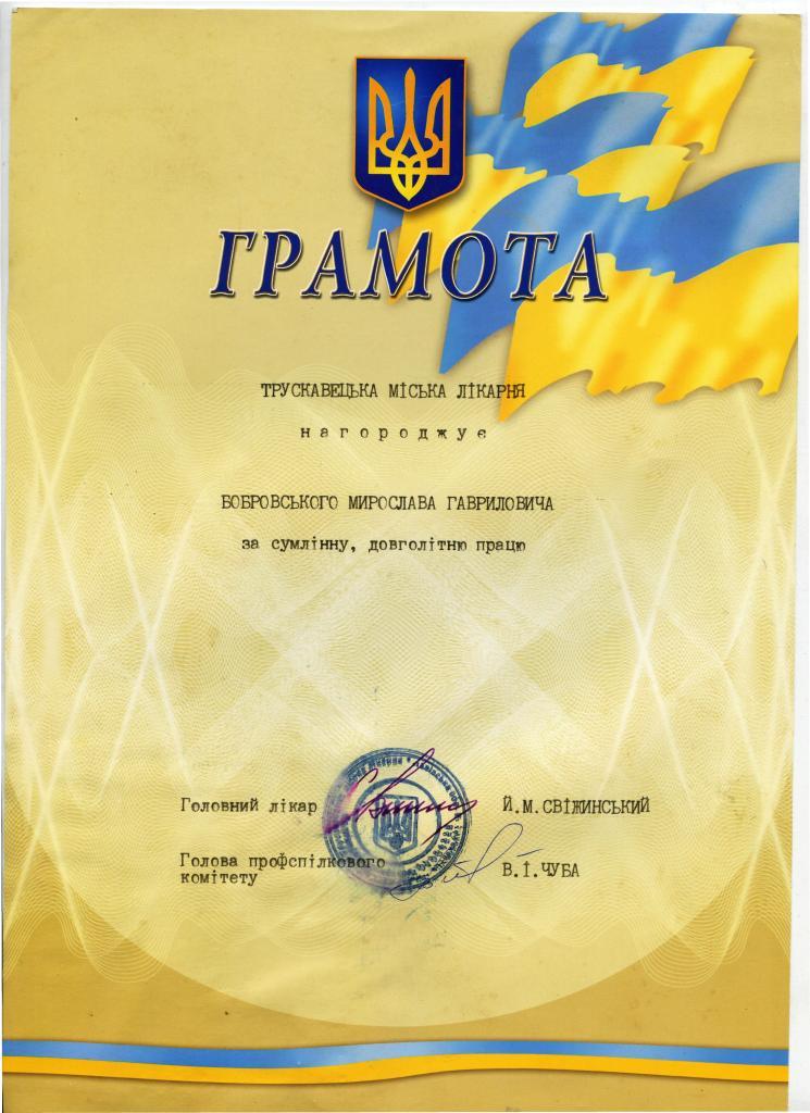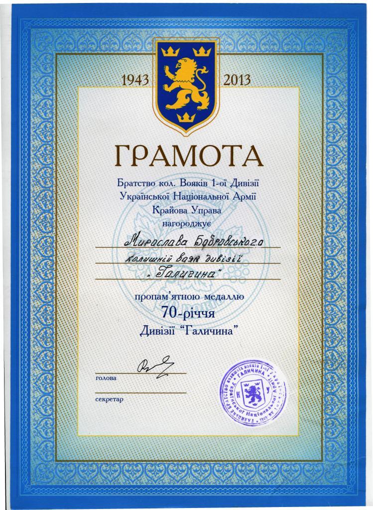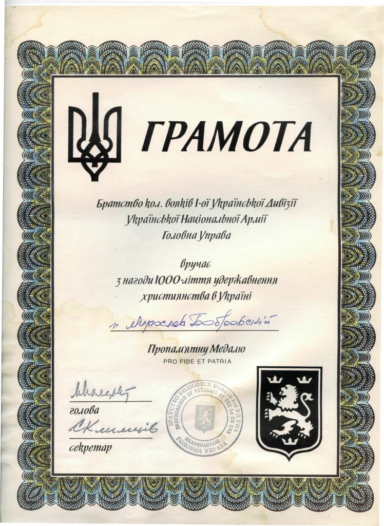Грамоти та посвідчення до медалей Мирослава Бобровського:
