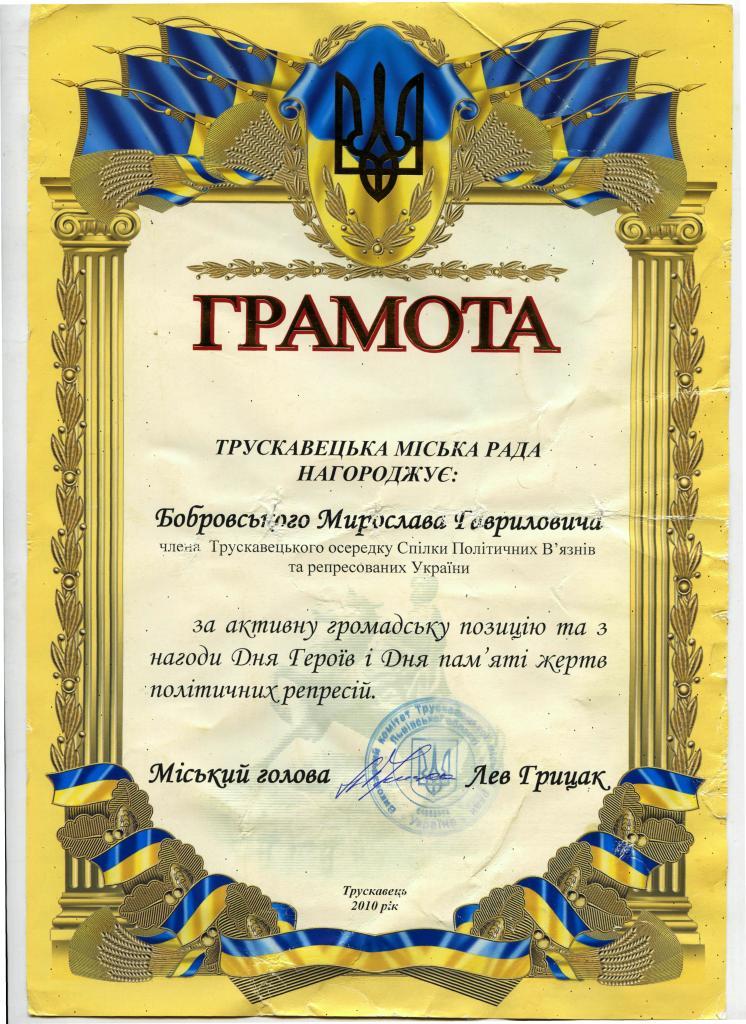 … З Мирославом Бобровським доля судила зустрітися і мені. Пригадую, як в 2011 році він переступив поріг редакції трускавецької газети «Франкова криниця Підгір`я» (я тоді був її редактором), щоб розповісти про своє життя. Ми довго тоді спілкувалися… Проте Мирослав Бобровський був настільки скромною людиною, що не хотів публікації в газеті, не хотів «слави», як він казав, а хотів просто розповісти про свій життєвий шлях.
