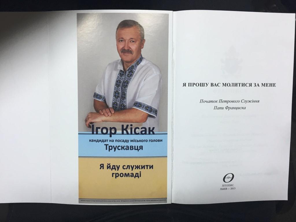 Дарує Кісак книгу Папи Франциска зі сюрпризом. Розкриваєш її та просто прозріваєш! Вже на другій сторінці видання фізіономія «святішого» Кісака. І щоб, не дай Бог, не викинули його агітку (бо направду, кому Кісака в хаті треба), приліпив він свою знимку міцно на клей.