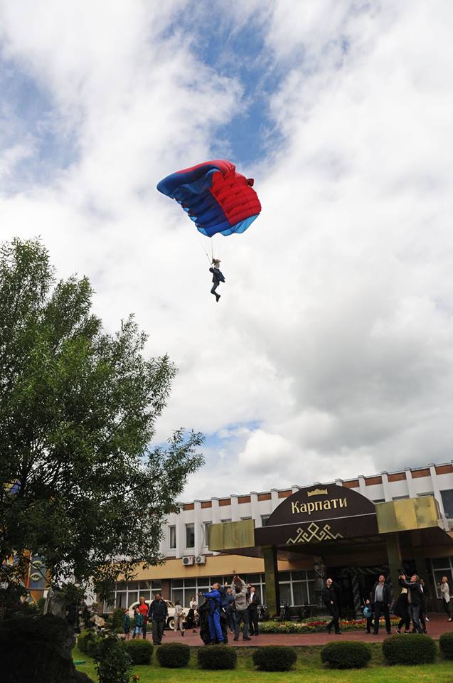 Авіашоу відбувалося у небі, а глядачі спостерігали за ним як з території «Карпат», так і з перегородженої на цих півгодини часу ділянки вулиці Данила Галицького, котра примикає до вул. Карпатська-Городище та питного озера. Вміле та вдале приземлення трьох парашутистів викликало бурхливі овації публіки.