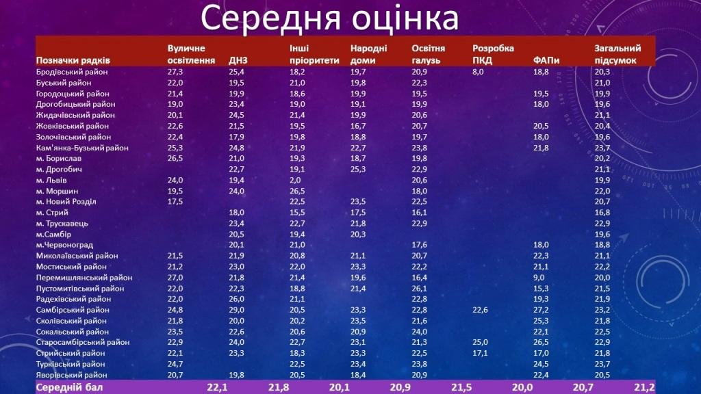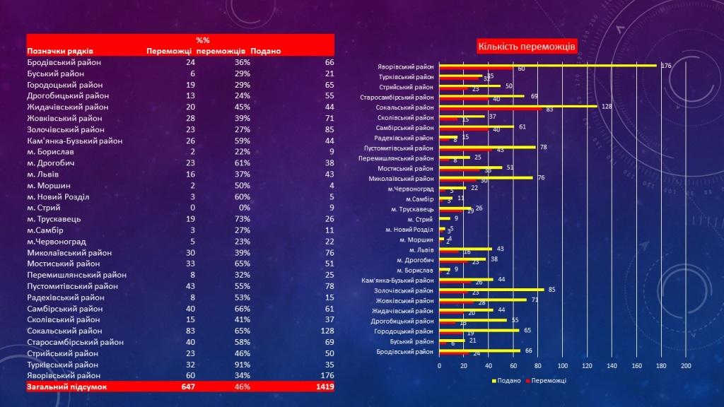 Попри такий оптимізм, Дрогобич не ввійшов у п’ятірку «переможців», оскільки з 38 поданих проектів перемогли 23 і відповідно процент успіху – 61%. Для порівняння, Трускавець подав 26 проектів, з них перемогли 19, процент успіху 73%. Дивує Стрий – подано 9 проектів, не переміг жоден…