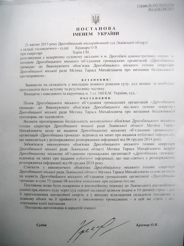 І зовсім абсурдним і таємним є рішення сесії ДМР «Про порядок використання плати за оренду комунального майна», що приймається щорічно. Згідно з ним, комунальні підприємства-балансоутримувачі, які надають в оренду нежитлові приміщення, що перебувають в їх повному господарському віддані, звільнені від перерахування орендної плати в міський бюджет! У цьому рішенні не зазначено площі приміщень, а найцікавішим є пункт 13 додатку-списку до рішення тих самих «обраних» підприємств – «Інші підприємства, установи та організації комунальної власності Дрогобицької міської ради», які, напевно, визначає впливовий чиновник. ГО «Дрогобицька громада» неодноразово зверталося з запитами щодо розкриття даних по цьому рішенню, але влада всіляко ігнорувала звернення. На сьогодні є Постанова Дрогобицького міськрайонного суду, яка визнає протиправною бездіяльність в. о. міського голови п. Метика Т. М. і зобов’язує його надати таку інформацію. Тож, сподіваємося таки її отримати і висвітлити громаді.