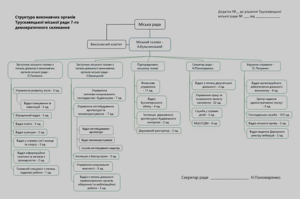 Перед нами – структура виконавчих органів влади, взята з офіційного сайту Трускавецької міської ради. Глянувши на неї, навіть нефахівець побачить, що штат роздутий до неможливості. Є такі підрозділи, яких немає в містах районного значення, а тому їх можна просто скоротити, є такі підрозділи, які без особливих роздумів можна запросто об`єднати по два-три в один. Є підрозділи, які ніби чимось і займаються, хоча правових повноважень не мають жодних і діють лише як страшилка для порушників чи як реклама на стовпі, на котру можна витратити набагато менше, ніж утримання штату в кількості 2-3-4 осіб.