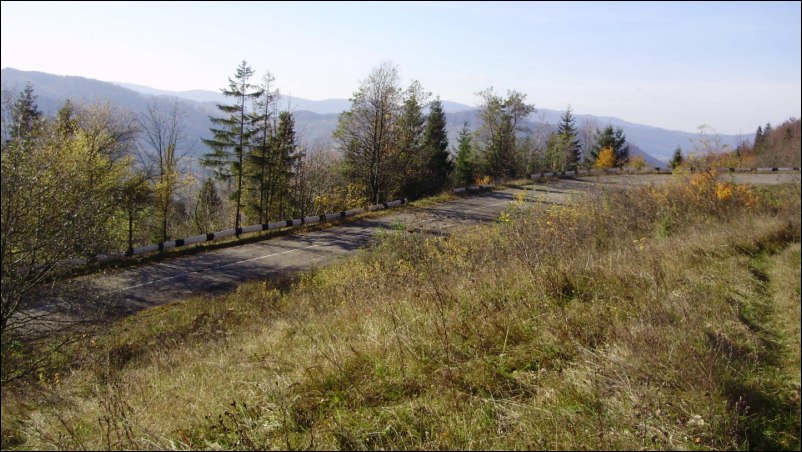 Прикордонники – солдати строчної служби. Пригостив хлопців солодким чаєм з лимоном. На холодному вітрі для них це було найкращим гостинцем. Від них взнав, що залізнична станція знаходиться на початку закарпатського села Волосянка аж за Ужком. Це зайвих чотири кілометри. Враховуючи, що від Сянок до Ужка приблизно 14 кілометрів, це збільшувало маршрут орієнтовно до 18-ти. Отож, витримуючи швидкий темп ходьби, частково «зрізаючи» шлях навпростець (була така можливість) я, думаю, встиг би дійти вчасно до станції Волосянка, якби не часті зупинки для фотографій та не привал на обід. До речі, піша подорож по серпантину була надзвичайно комфортною. На південній стороні гірського пасма, по якому серпантином звивається дорога, вітру не було зовсім, було доволі тепло, сухо і комфортно. А яскраві осінні кольори листяних закарпатських лісів заставляли щораз зупинятись та робити знімки неймовірно красивих пейзажів і картин, які відкривались оку.