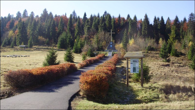 Пронизливий, доволі сильний і холодний вітер! Це й не дивно – надворі пізня осінь, а висота майже 900 м над рівнем моря. Місцина вітряна, бо знаходиться на шляху перетоку повітря з області підвищеного тиску в область пониженого, яким є наша сторона Карпат. Дорога нова, але по краях зроблена неякісно і де-не-де краї обвалюються. На узбіччях – болото з водяними калюжами. Попереду – братська могила російським і австро-угорським воякам, полеглим в 1914-15 роках. За могилою знаходиться стежка, по якій починається туристичний маршрут на найвищу гору Львівщини – Пікуй (1 408 м)