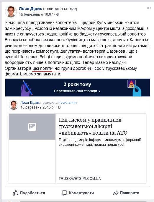Чомусь непоміченим залишився допис голови ГО «Рада міста» Л. Дідик від 15.03.2018 р. на її сторінці в мережі Фейсбук, у якому вона обзиває найавторитетнішу волонтерську організацію нашого краю «Дрогобиччина SOS» «політичною групою».