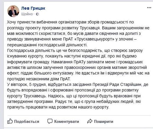 «Хочу принести вибачення організаторам зборів громадськості по розгляду проекту програми розвитку Трускавця. Вашим запрошенням не мав можливості скористатися, бо мусів давати свідчення на допиті з приводу звинувачення мене ПрАТ «Трускавецькурорт» у злочині – перешкоджанні господарській діяльності.
