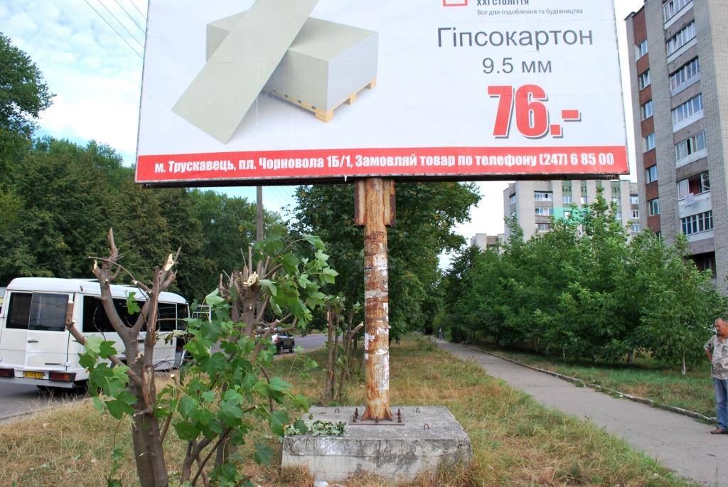 На заклики жінок, які стали свідками рубки молодих кленів та намагалися зупинити протиправні дії, чоловіки, що нищили дерева, відповіли: “Нам сказало керівництво, от ми і рубаємо”. Причина, чому зрубали клени, проста – вони закривали рекламу трускавецького супермаркету “Будівельні технології ХХІ століття”.