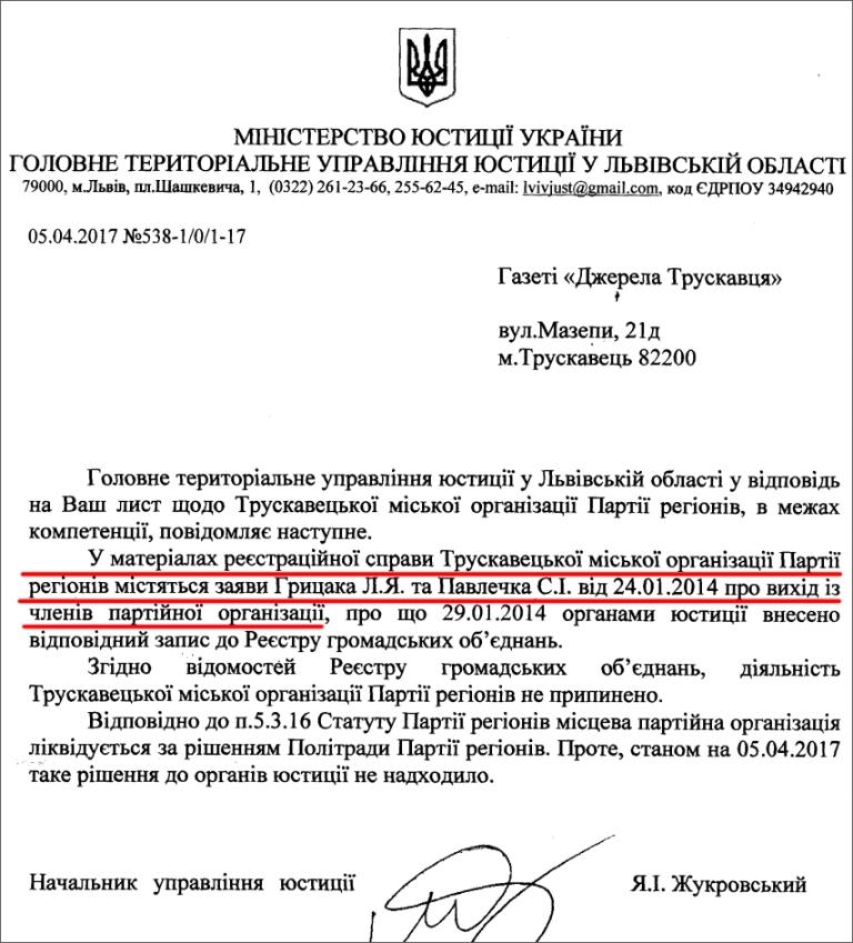 Тож відтепер будь-які маніпуляції щодо застарілої інформації на сайті Мін`юсту можуть трактуватися як намагання окремих осіб реанімувати Партію регіонів у Трускавці, з якої Лев Грицак вийшов більше трьох (!) років тому.