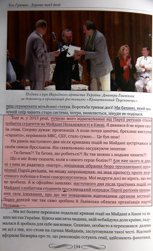 По-друге, стаття Ольги Куц зробила Левові Грицаку величезну послугу. Мало того, що безкоштовний піар його особисто та його автобіографічної книги «Дерева моєї долі», мало того, що оприлюднено цілу сторінку з цієї книги, де Лев Грицак детально розповідає про свій вихід з Партії регіонів, так журналістка ще й оприлюднила відповідь Головного територіального управління юстиції у Львівській області, в якому підтверджується факт написання Левом Грицаком заяви про вихід з ПР 24 січня 2014 року, тобто напередодні активної фази Революції Гідності.