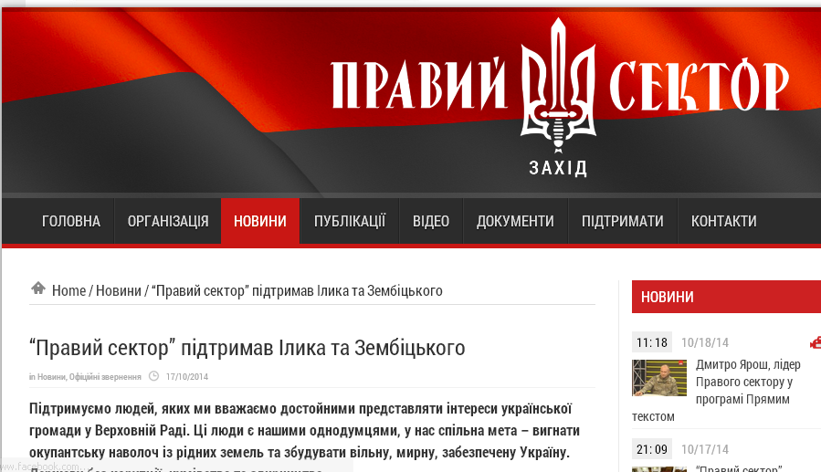 Як інформує прес-служба Романа Ілика, народного депутата України та кандидата в народні депутати України по 121 Дрогобицькому мажоритарному виборчому округу, на сайті «Правий Сектор Захід» вчора, 17 жовтня, оприлюднено заяву про підтримку цією політичною силою ще двох кандидатів. Так, у новині «Правий Сектор» підтримав Ілика та Зембіцького» зазначено: