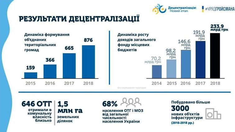 – Власні доходи місцевих бюджетів виросли з 68,6 млрд грн 2 2014 році до 233,9 млрд у 2018 році.