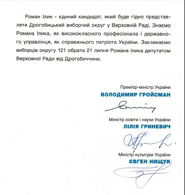 «Роман Ілик – єдиний кандидат, який буде гідно представляти Дрогобицький виборчий округ у Верховній Раді. Знаємо Романа Ілика як висококласного професіонала і державного управлінця, як справжнього патріота України. Закликаємо виборців округу 121, обрати 21 липня Романа Ілика депутатом Верховної Ради від Дрогобиччини», йдеться у зверненні.
