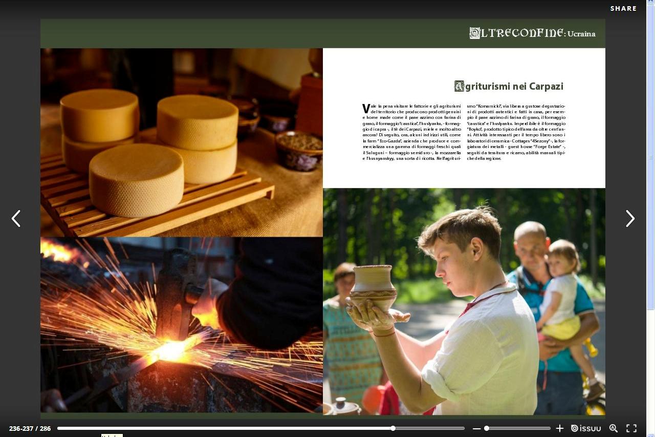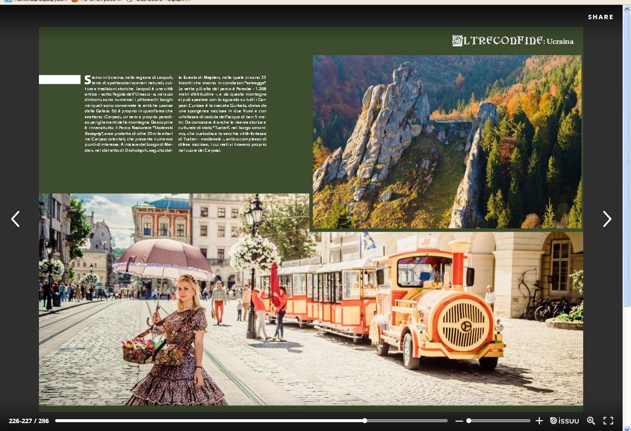 На 20 сторінках журналу – інформація про Львівщину та красиві фото. Засніжені вершини Карпатських гір, львівський туристичний трамвайчик, скелі в Уричі, зелений туризм, сироварні, церква в Східниці і відпочинок в Східниці, гірськолижні курорти – приємно бачити на сторінках італійського глянцевого видання рідні краєвиди Львівщини. Хоча навряд чи італійці їхатимуть в Україну, аби спробувати місцевого сиру.