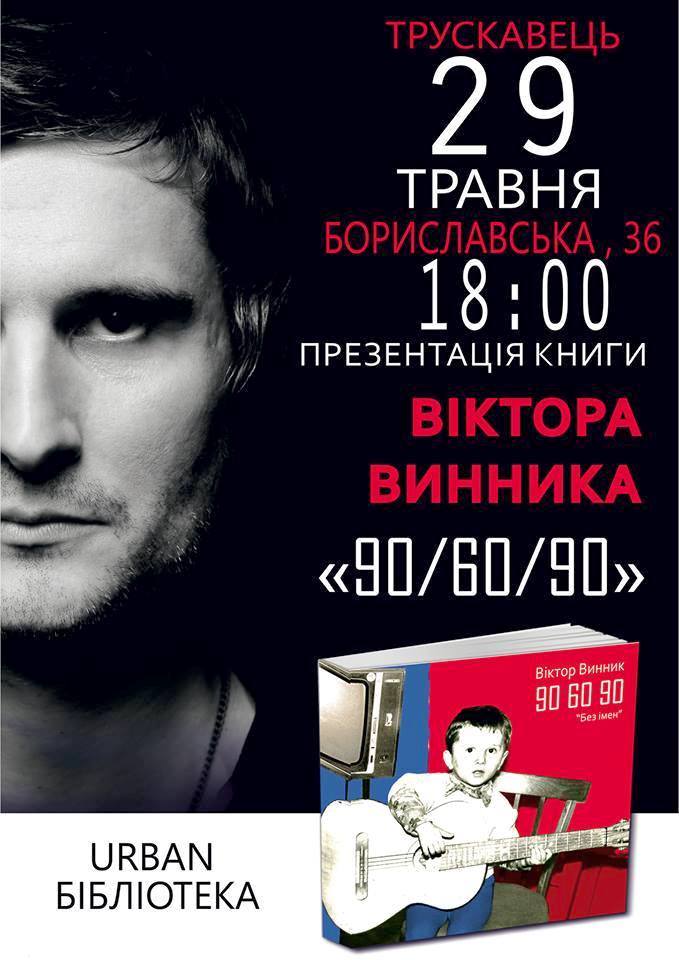 У наступний понеділок, 29 травня, о 18.00 в УРБАН-бібліотеці Трускавця відбудеться презентація дебютної книжки співака, фронтмена групи «МЕРІ», трускавчанина Віктора Винника. Про це поінформувала завідувачка УРБАН-бібліотеки Віра Савка.