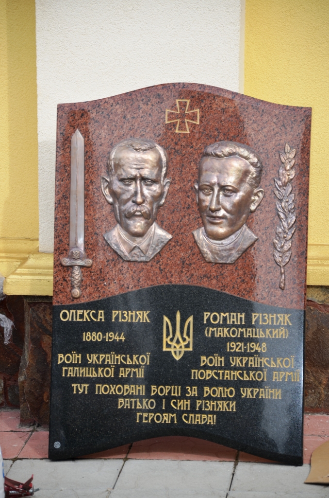 Меморіальна таблиця присвячена двом українським героям із Трускавця – Олексі Різняку (1880-1944) та Роману Різняку (Макомацькому) (1921-1948). Батькови та сину. Воїнови Української Галицької Армії та воякови Української Повстанської Армії, які знайшли собі тут місце спочинку. Мабуть, у цьому й полягає таємниця тої органічности, з якою таблиця посіла своє місце на храмовій стіні. Та не тільки в цьому.