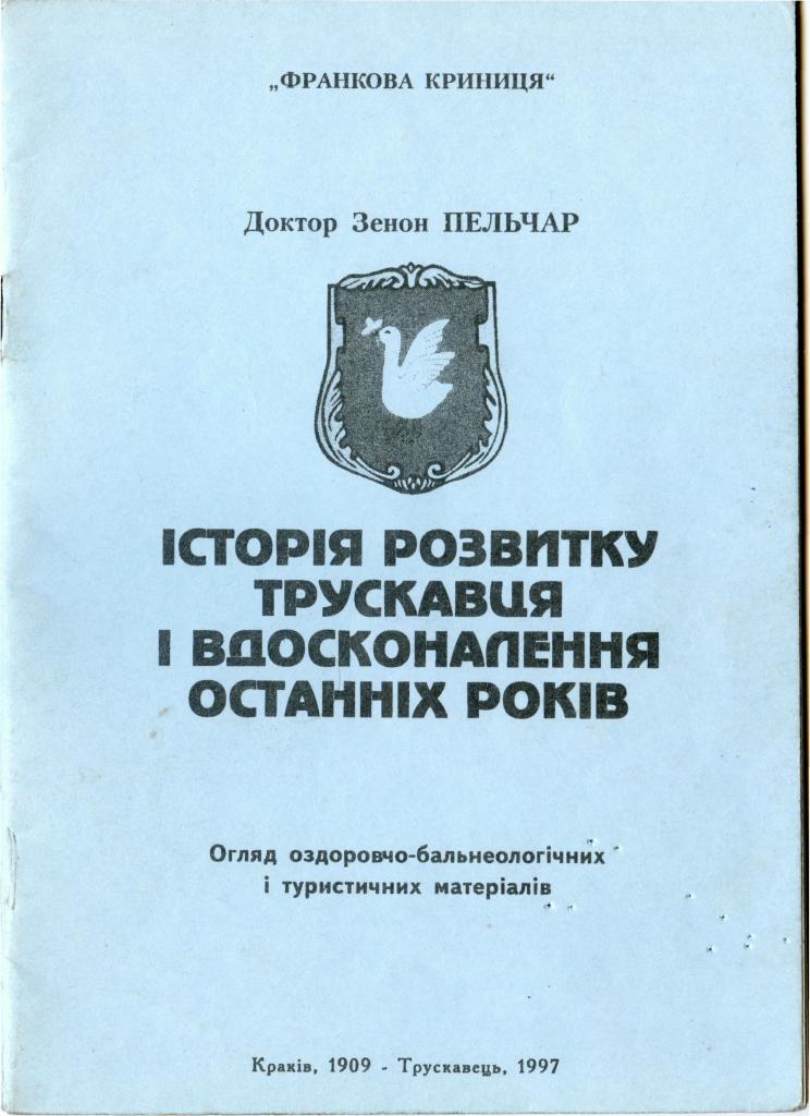 Виповнилося уже 115 років, як світ побачив цікаву працю польського лікаря Зенона Пельчара «Історія розвитку Трускавця і вдосконалення останніх років», що вийшла у Кракові у 1009 році, та 17 років, як вперше ця праця була перекладена українською мовою завдяки старанням Галини Заборовської та Надії Бойсан, редакційного колективу газети «Франкова криниця», очолюваної Ігорем Сусюком. Зараз ця, невелика за обсягом книжка, стала бібліографічним раритетом. За останні роки її ніхто не перевидавав ні в Трускавці, ні в Польщі. А цінна вона як для сучасних відпочивальників, так і читачів взагалі тим, що автор дає не лише розгорнутий опис тогочасного курортного Трускавця, що важливо для тих, хто цікавиться історією курорту, але детально зупиняється на лікувальних можливостях мінеральних джерел і, зокрема, відомої уже тоді унікальної Нафтусі.