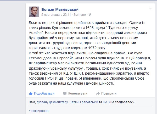 “Хочеться відзначити, що скандальна правка, яка була Рекомендована Європейським Союзом була відхилена. В цій правці я, як парламентар, мав би визнати легальними одностатеві відносини. Враховуючи українську культуру , традиції, християнські вірування, а також звернення УГКЦ, УПЦ КП, рекомендаційний характер, я вперто голосував ПРОТИ цієї правки. Я впевнений, що Європейський Союз буде зважати на наші культурні і духовні цінності” – зазначив Матківський.