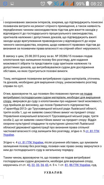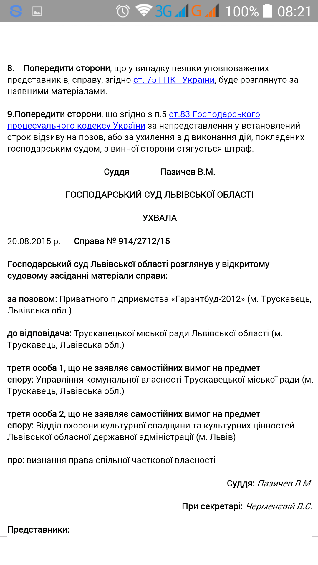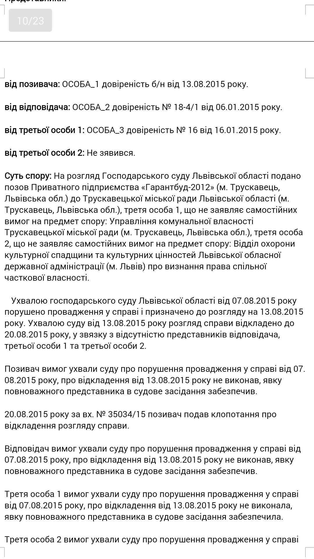 Але орендар попри це не поспішає приступати до приватизації шляхом викупу. Натомість 7 серпня 2015 року ПП «Гарантбуд – 2012» звертається в Господарський суд Львівської області з проханням порушити провадження у справі про визнання права спільної часткової власності на приміщення колишньої санстанції. Платить судовий збір у розмірі 24 тис грн. (порівняйте викупну ціну у розмірі понад 2 млн.грн.) і сподівається на позитивне вирішення справи.