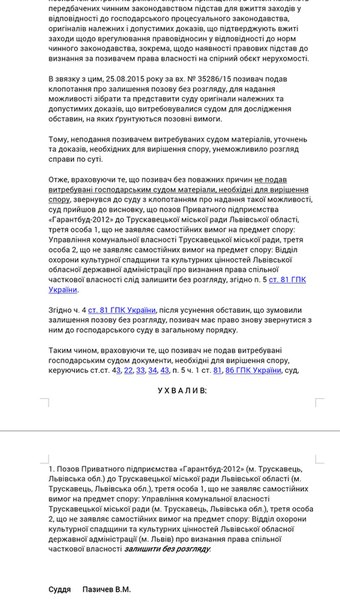 Відповідач- Трускавецька міська рада, треті особи, що не заявляють самостійних вимог у позові: Управління комунальної власності Трускавецької міської ради та Відділ охорони культурної спадщини та культурних цінностей Львівської обласної державної адміністрації.
