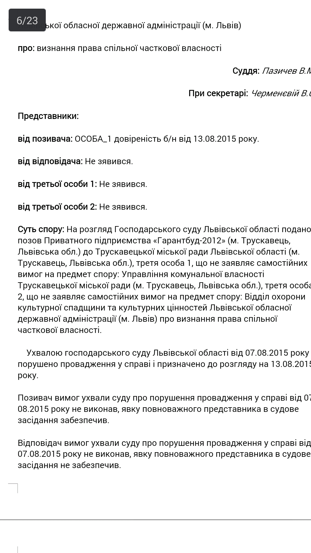 Цього разу були представники позивача, відповідача та Управління комунальної власності м. Трускавець. Відділ охорони культурної спадщини та культурних цінностей Львівської обласної державної адміністрації свого представника не надав.