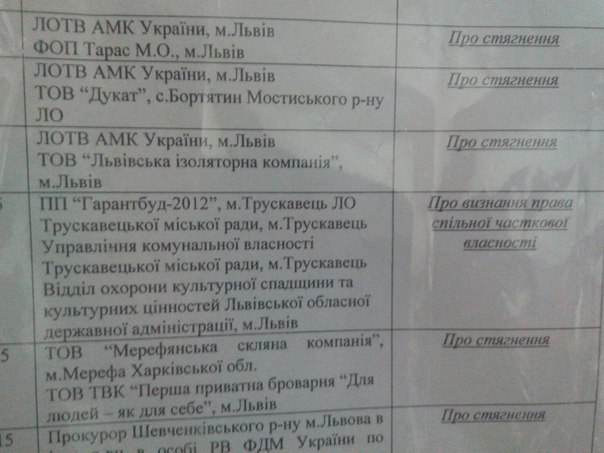 На засідання з’явились: Сегер Ольга Ярославівна-начальник управління комунальної власності Трускавецької міської ради, Петренко Олег Васильович-завідуючий юридичного відділу Трускавецької міської ради, представники громадських організацій та преси м. Трускавець. Позивач не з’явився, хоча, як кажуть джерела, його представник був присутній у приміщенні суду, але чомусь до судової зали не потрапив.