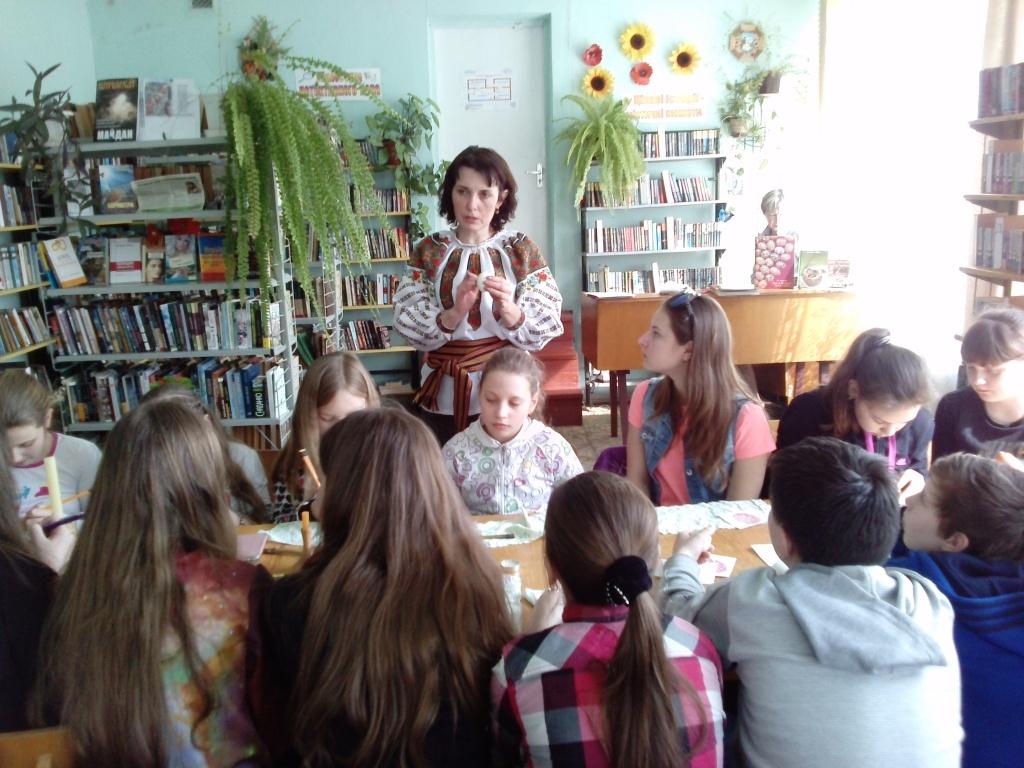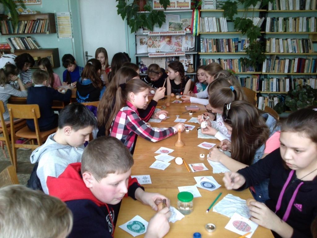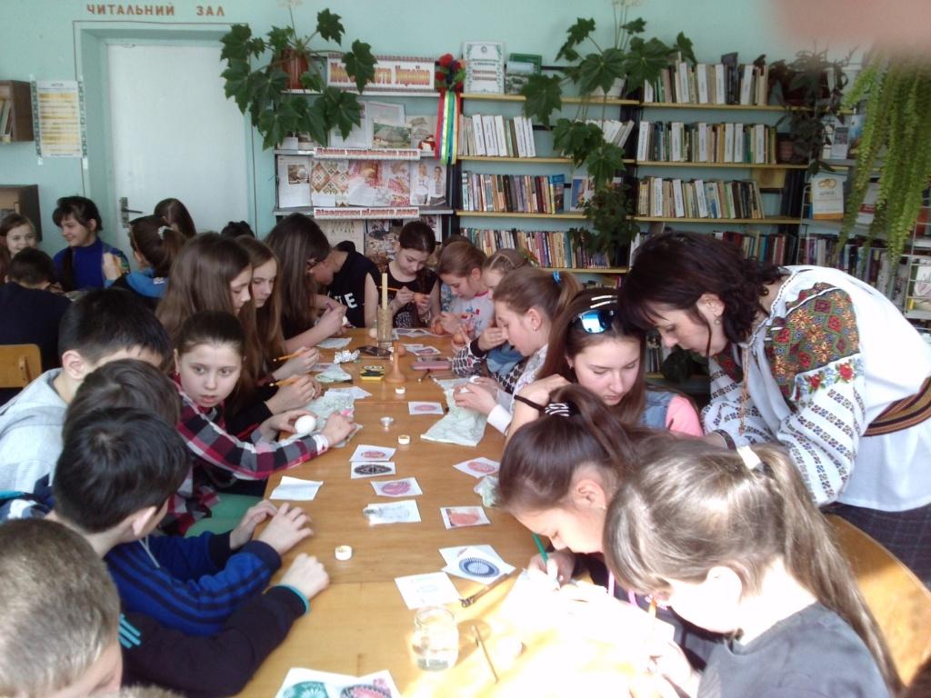 Майстер-клас з написання писанки відбувся 25 березня в бібліотеці-філії №1. Бібліотекар по роботі з юнацтвом Наталя Іваночко організувала Великодній вернісаж «Писанковий дивосвіт». Своїм умінням писати великодню писанку з учнями СЗШ №1 поділилася майстриня, заступник директора Будинку учнівської творчості Любов Михайлівна Гривняк. Вона розповіла про усі тонкощі писанкарства та оригінальний орнамент писанок, які чарують своєю вишуканістю, мініатюрністю, гармонією колориту.