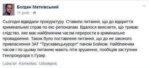 «Відвідали Генеральну прокуратуру. Ставили питання щодо відкриття кримінальних справ по екс-регіоналам. Вдалося вияснити, що триває слідство, яке має найближчим часом перерости в кримінальне провадження. Також було поставлене питання щодо незаконного привласнення ЗАТ “Трускавецькурорт” паном Бойком. Найближчим часом і по цьому питанню мають піти зрушення, пообіцяв заступник Генпрокурора п. Гузир», – поділився інформацією на своїй сторінці в мережі Фейсбук народний депутат від Дрогобиччини Богдан Матківський. Судячи з запису, зустріч в Генеральній прокуратурі України, де піднімалося і питання «Трускавецькурорту», відбулася в четвер, 23 квітня.