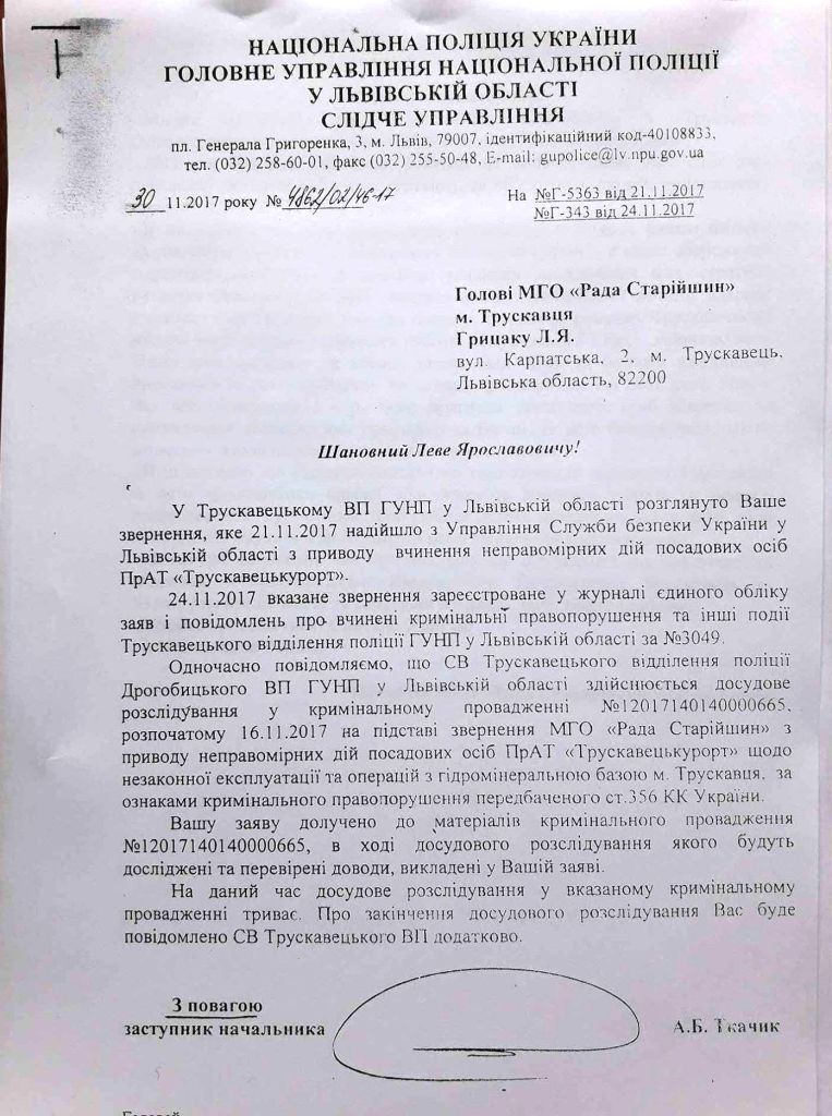 З приводу вчинення неправомірних дій посадових осіб ПрАТ «Трускавецькурорт» щодо незаконної експлуатації та операцій з гідромінеральною базою м. Трускавця, за зверненням МГО «Рада Старійшин», СВ Трускавецького відділення поліції Дрогобицького ВП ГУНП у Львівській області, розпочато кримінальне провадження №12017140140000665 за ст.365 КК України (лист ГУ НП України у Львівській області від 30.11.2017 року за № 4862/02/46-17, додається до звернення)