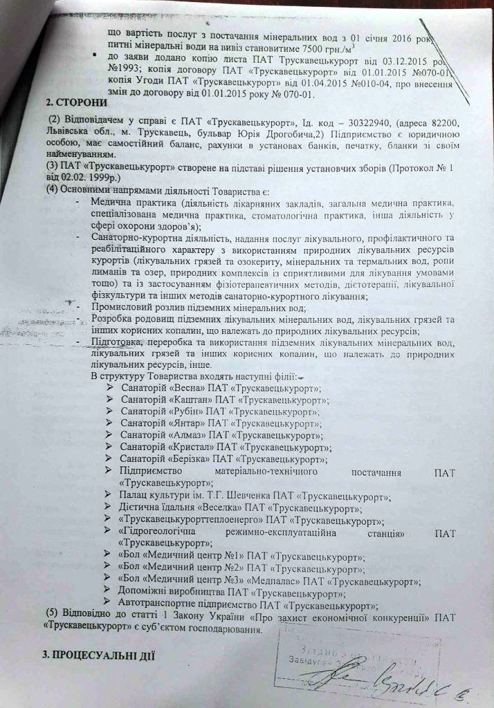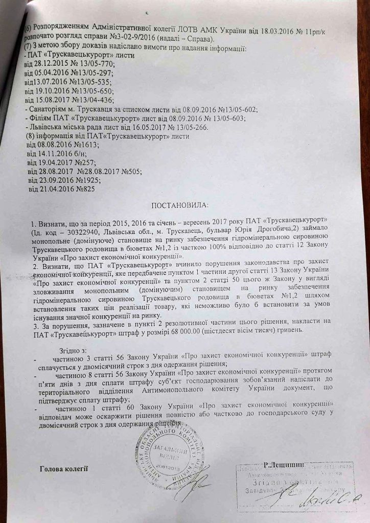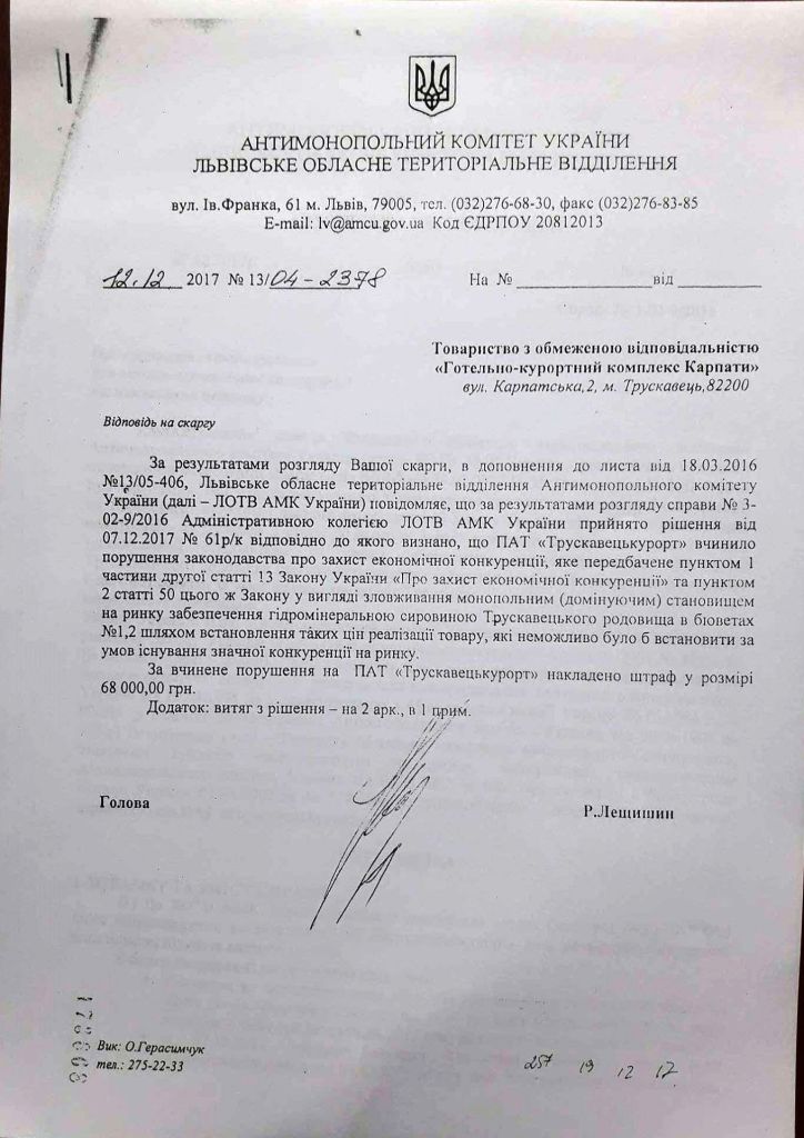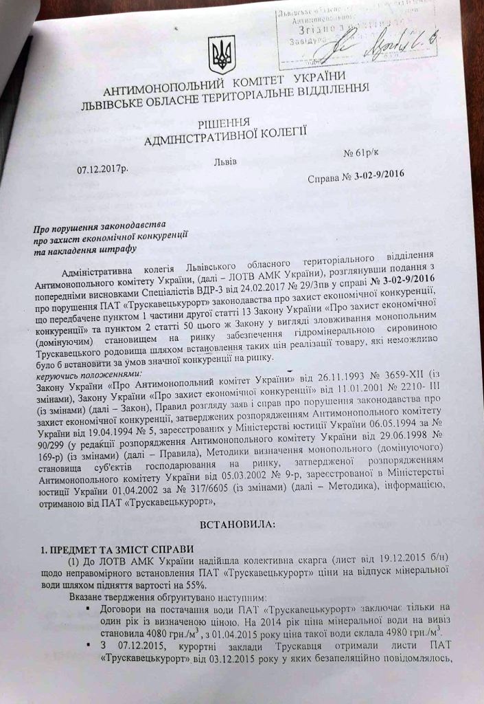 З даного приводу міська громадська організація «Рада Старійшин» звернулася до Львівського обласного територіального відділення Антимонопольного комітету України (далі – ЛОТВ АМК України). За результатом розгляду звернення ЛОТВ АМК України прийняло рішення від 17.12.2017 №61р/к відповідно до якого визнано, що ПрАТ «Трускавецькурорт» вчинило порушення законодавства про захист економічної конкуренції, яке передбачене пунктом 1 частини другої статті 13 Закону України «Про захист економічної конкуренції» та пунктом 2 статті 50 цього ж Закону, у вигляді зловживання монопольним (домінуючим) становищем на ринку забезпечення гідромінеральною сировиною Трускавецького родовища в бюветах № 1,2 шляхом встановлення таких цін реалізації товару, які неможливо було б встановити за умов існування значної конкуренції на ринку. За вчинене порушення на ПрАТ «Трускавецькурорт» накладено штраф у розмірі 68 тис. грн. (лист ЛОТВ АМК України від 12.12.2017 року за №13/04-2378 додається до звернення).