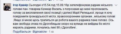 «Сьогодні 15.09.16 р. о 15.54 год. зателефонував радник міського голови пан-товариш Качмар Василь з погрозами, що мені проламають голову за висловлення своєї позиції у дописі Марії Репецької. Про це я хочу повідомити громадськості міста, правоохоронним органам, міському голові. Якщо зі мною щось трапиться, це робота вашого радника, пане голово. Ось вам свобода слова по-дрогобицьки, скоро на вулицю не вийдеш, бо містом керують радники. Почались лихі 90-ті у Дрогобичі».