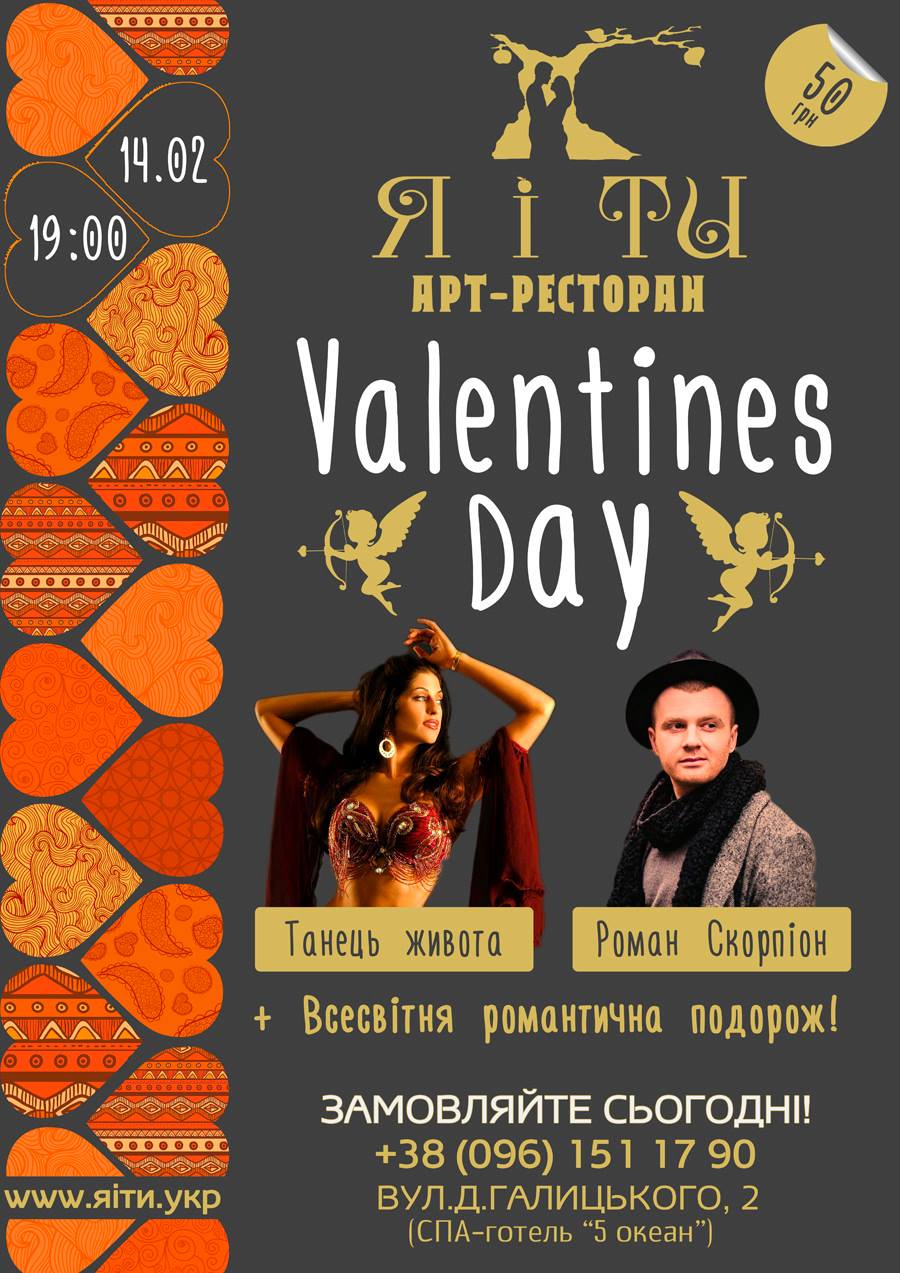 У суботу, 14 лютого, в арт-ресторані «Я і ТИ» (м. Трускавець, вул. Д. Галицького, 2) відбудеться вечірка з нагоди Дня святого Валентина. У програмі – Всесвітня романтична подорож, виступ співака Романа Скорпіона, екзотичний східний танець живота та інші атракції. Вхід – 50 грн. Початок вечірки – о 19.00. Замовлення столиків – за тел. 096-151-17-90.