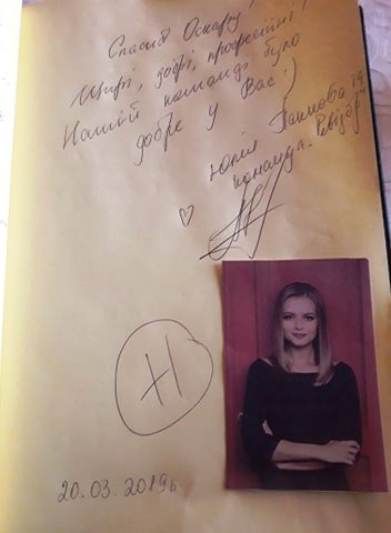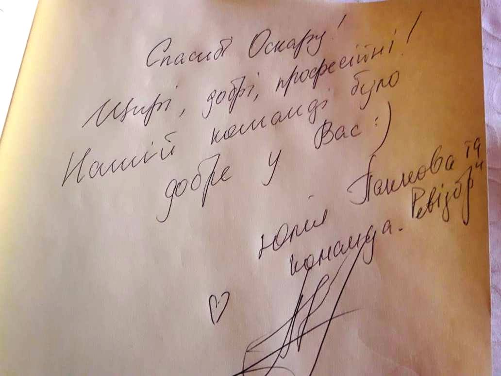 – В нас часто зупиняються люди, які приїжджають на різні конференції, – продовжує Олег Іванович.. – Через організатора рецепція кілька разів пробувала з`ясувати, що вони собі бажають. Бо коли заїжджає група людей, то ми стараємося попередньо дізнатися їхні запити, щоб якнайкраще надати потрібні послуги. Вийшло так, що організатор зовсім нічого не знав про їхні запити. Як правило, вони резервують місця через туристичну фірму або через когось з організаторів. Чи так співпало, що вони третій раз в «Оскарі», чи це свідомо вони обрали саме наш готель, – цього не можу сказати, для мене це залишається загадкою. В нас «Ревізор» глибокої перевірки не робив, поснідали – і вперед, до праці. Та все ж оглядову перевірку «Оскара» робили всі три рази, коли у Трускавець приїжджав «Ревізор». Претензій до нас не було жодних. Вони проживали в «Оскарі» з суботи по четвер; спочатку заїхало їхнє керівництво, а основна група заїхала в неділю. Така ж група заїхала і у Львові, але про Львів в мене інформації немає. Лише один раз вони замовляли в нас обід, і раз – вечерю. У книзі відгуків написали: «Спасибі «Оскару»! Щирі, добрі, професійні! Нашій команді було добре у вас. Юлія Панкова та команда «Ревізор».