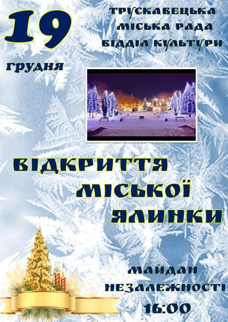 Вже традиційно у Трускавці відкриття Різдвяної ялинки відбудеться за кілька днів до Католицького Різдва, а саме в день святого Миколая, 19 грудня. Цього року 19 грудня припадає на вихідний день, суботу. Церемонія урочистого відкриття Різдвяної ялинки у Трускавці розпочнеться 19.12 о 16.00.