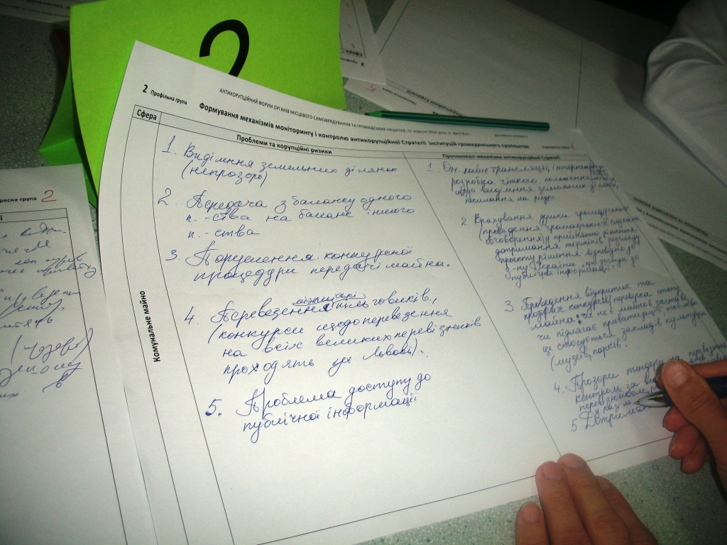 Важливим результатом роботи Антикорупційного форуму органів місцевого самоврядування та громадських ініціатив, який проходив 31 серпня у Дрогобичі за сприяння Львівської ОДА та Міжнародного фонду «Відродження», стала розробка механізмів антикорупційної стратегії. Учасники форуму на практичному занятті динамічної мережі (інші назви – світове кафе, фокус-групи) не лише чітко окреслили основні корупційні ризики в різних сферах, але і запропонували конкретні механізми антикорупційної стратегії.