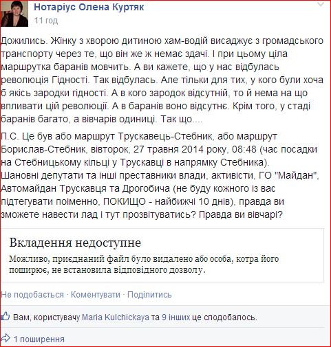 Дожились. Жінку з хворою дитиною хам-водій висаджує з громадського транспорту через те, що він же ж немає здачі. І при цьому ціла маршрутка баранів мовчить. А ви кажете, що у нас відбулась революція Гідності. Так відбулась. Але тільки для тих, у кого були хоча б якісь зародки гідності. А в кого зародок відсутній, то й нема на що впливати цій революції. А в баранів воно відсутнє. Крім того, у стаді баранів багато, а вівчарів одиниці. Так що….