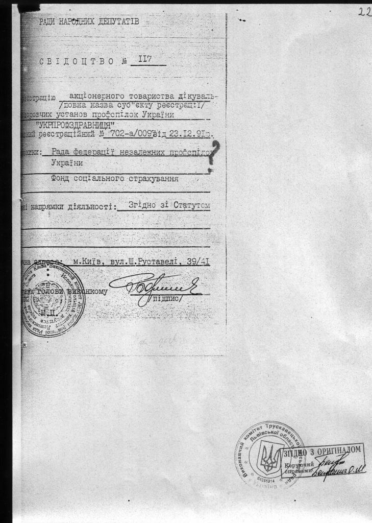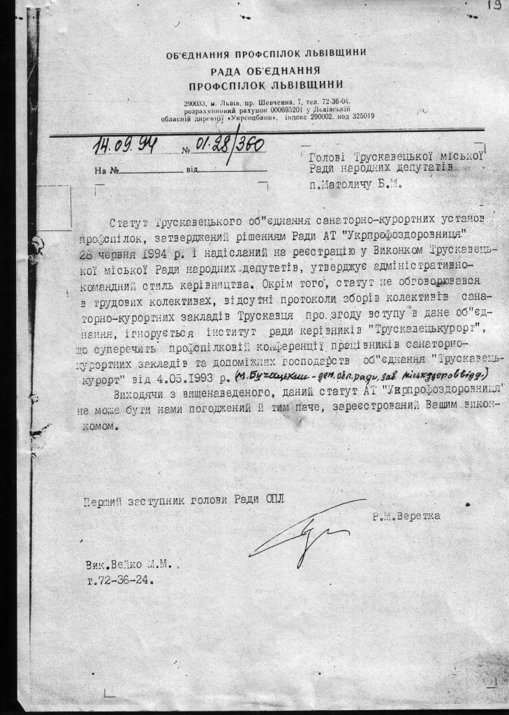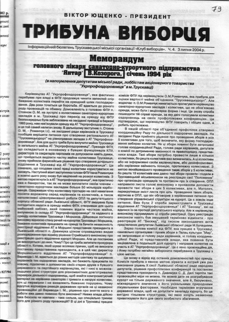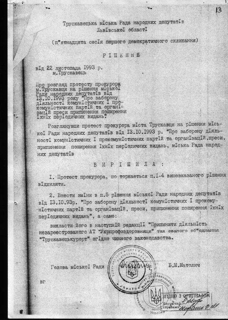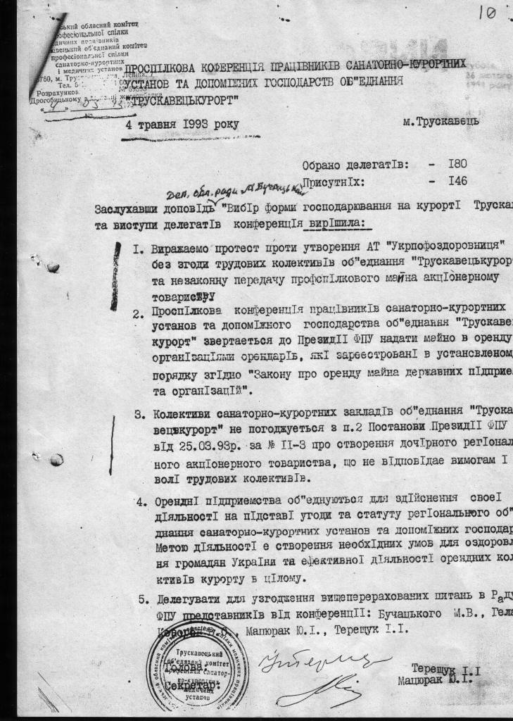 1.1. З самого початку оголошення тодішньою профспілковою структурою «Трускавецькурорт» про утворення акціонерного товариства, переважаюча більшість колективів відмовилась від акціонерної форми власності. Про що свідчить протокол конференції профспілок медпрацівників Трускавця від 04 травня 1993 року. (див. сторінка 10), окрім того існує ідентичне рішення обласної профспілки від 14.09.1994 р (див. сторінка 19)в якому керівнитво обласної профспілки вважає незаконним утворення АТ. Ці рішення мотивувались наступним: 1. Порушено постанову ВР Української РСР «Про захист суверенних прав власності Української РСР» від 29 листопада 1990 року №506-Х11, в якій констатовано: «…До введення в дію Закону Української РСР про роздержавлення майна: