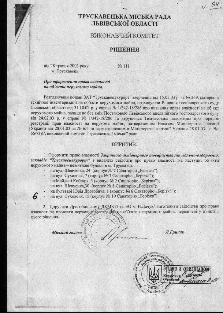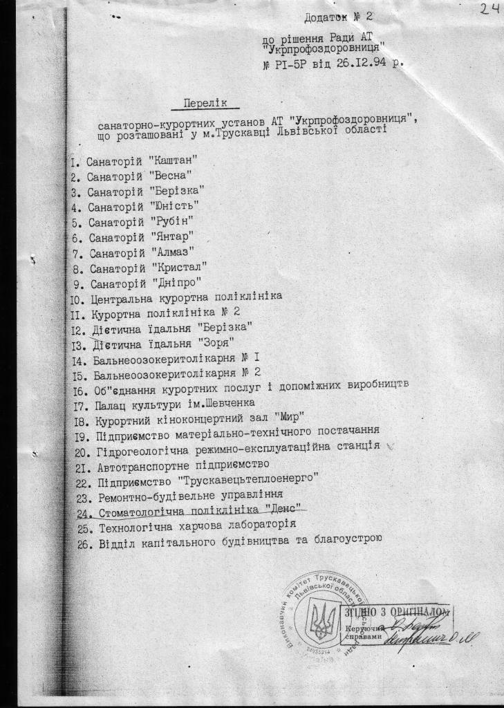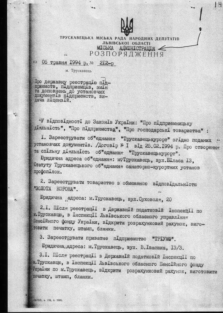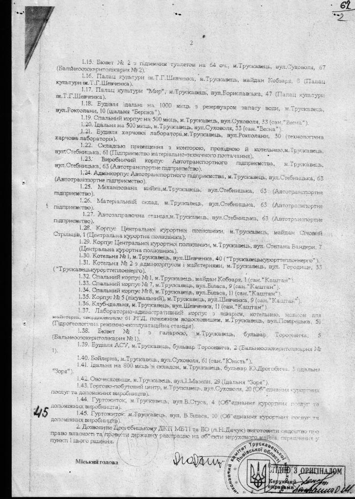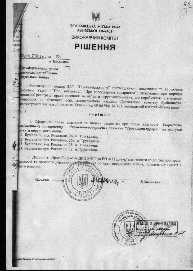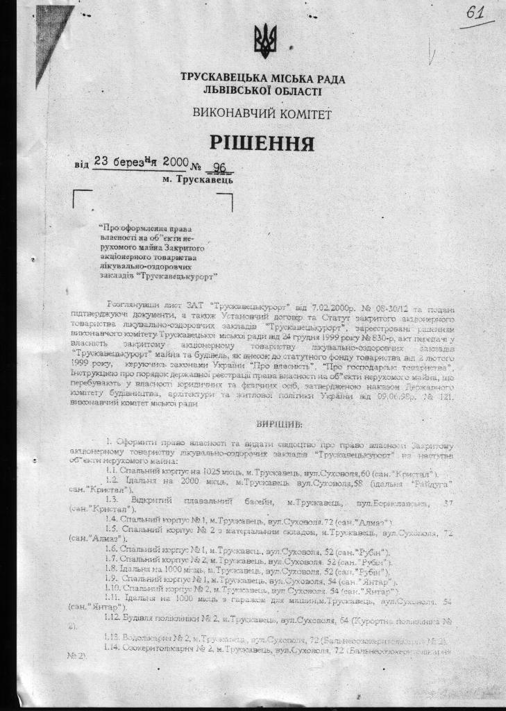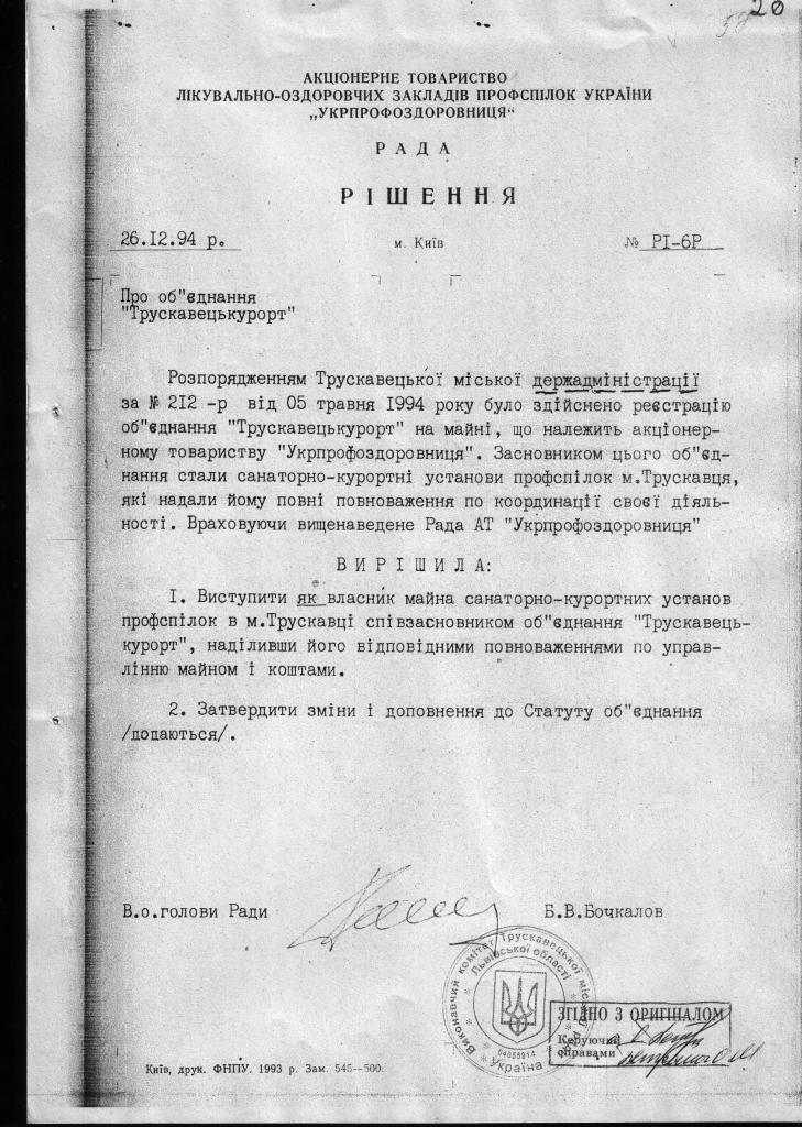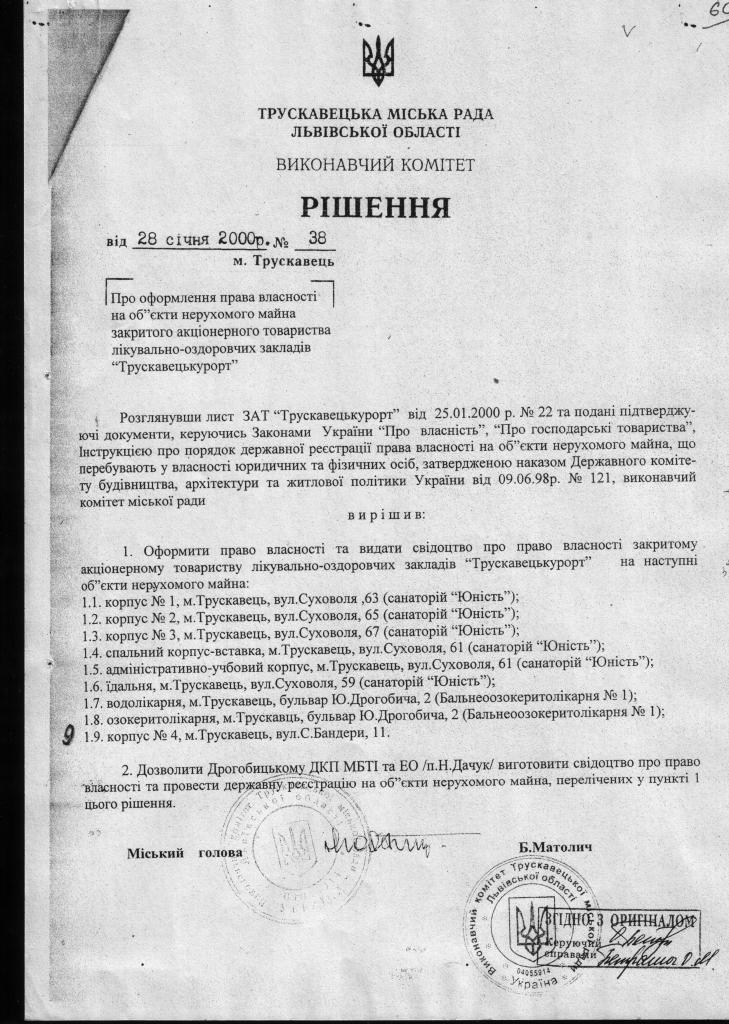1.         ЩОДО ПИТАННЯ ЗАКОННОСТІ (НЕЗАКОННОСТІ) СТВОРЕННЯ ТРУСКАВЕЦЬКОГО ОБ’ЄДНАННЯ «ТРУСКАВЕЦЬКУРОРТ» (АКЦІОНЕРНОГО ТОВАРИСТВА)), В ПРОЦЕСІ ВИВЧЕННЯ НАЯВНИХ МАТЕРІАЛІВ ВИЯВИЛИ НАСТУПНЕ:
