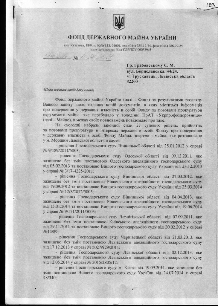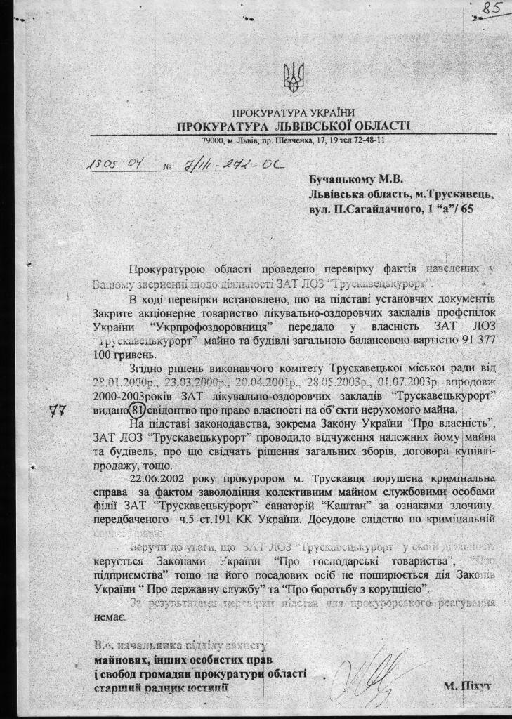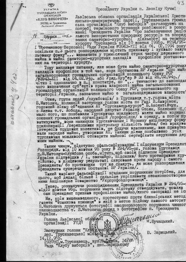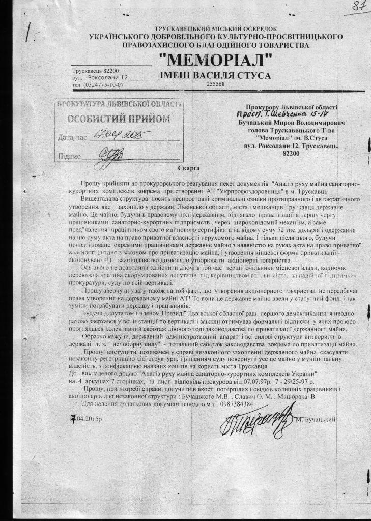 1. В Прокуратуру з вимогою виступити в інтересах держави Україна в особі фонду держмайна та територіальної громади м. Трускавець з позовом до ПрАТ «Трускавецькурорт», укрпрофоздоровниця про повернення з незаконного володіння санаторно-курортних закладів що збудовані до 1939 року і після 1939 року. З врахуванням подібного звернення поданого УДКППБ т-ва «Меморіал» імені В.Стуса.