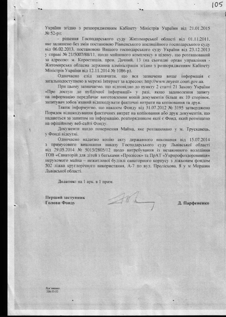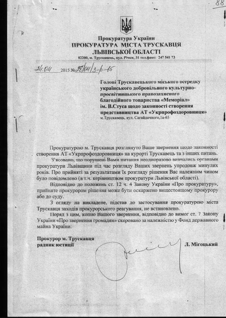 2. Звернутися в НАБУ з проханням перевірити наявність ознак корупції в діях(бездіяльності) прокуратури, яка розглядала звернення Трускавецької організації меморіал від 17.04.2015 року (голова М.Бучацький) та обмежилась формальною відповіддю. Додаток 7
