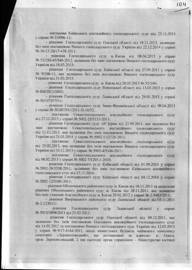 Комісією було встановлено, що існує понад 27 судових рішень за позовами прокурорів в інтересах держави в Україні(відповідь фонду держмайна на запит Грабовського С.М. сторінки 103-107), щодо витребування майна з незаконного володіння укрпрофоздоровниці їх власнику, а саме державі Україна. Рішення набули законної сили та за цими рішеннями було скасовані незаконно отримані права власності.